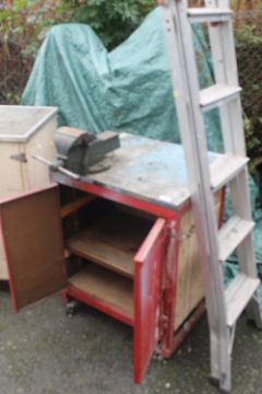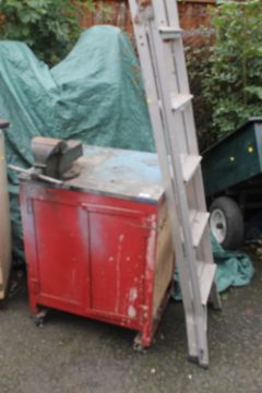 A STEEL / WOOD WORK CABINET WITH RECORD VICE TOGETHER WITH ALUMINUM STEP LADDERS