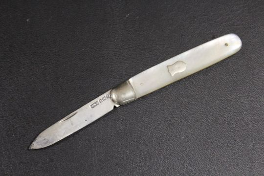 A HALLMARKED SILVER BLADED MOTHER OF PEARL FRUIT KNIFE