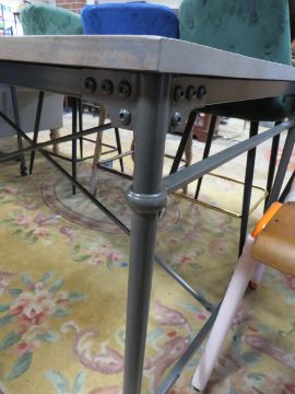 A MODERN INDUSTRIAL STYLE LIMED TABLE WITH CASTORS