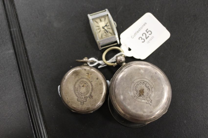 A CHESTER HALLMARKED SILVER EXPRESS ENGINE LEVER OPEN FACED, MANUAL WIND POCKET WATCH, TOGETHER WITH A SMALLER EXAMPLE AND A VINTAGE WRISTWATCH MOVEMENT AND CASING - ALL A/F (3)