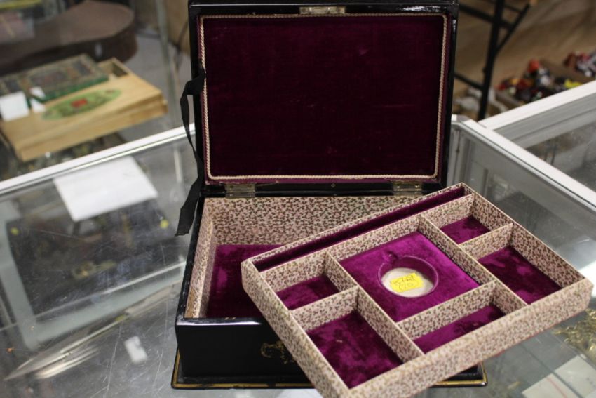VINTAGE PAPER MACHE DECORATIVE JEWELRY BOX GOLD PAINTED AND WITH MOTHER OF PEARL