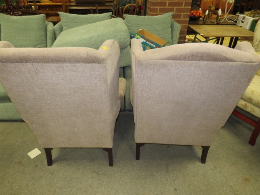 A PAIR OF MODERN WING BACK ARMCHAIRS