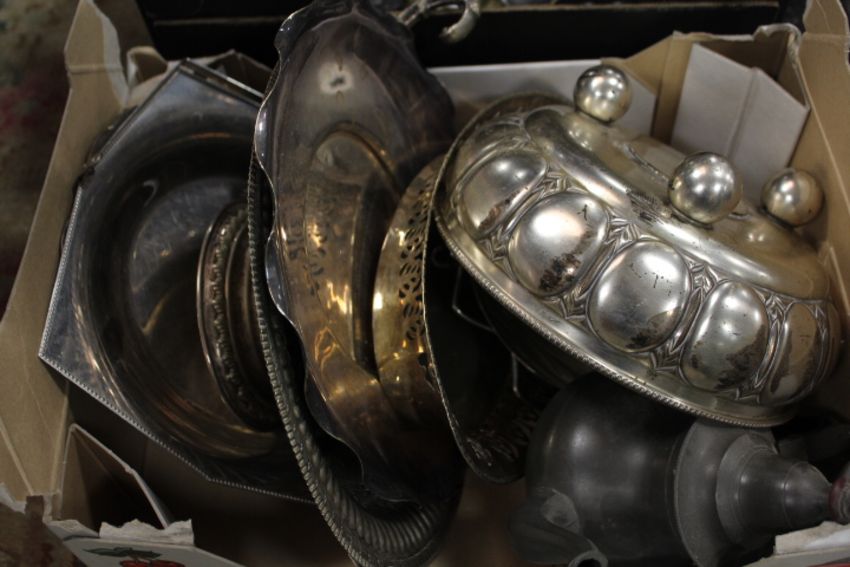 THREE TRAYS OF ASSORTED METAL WARE TO INCLUDE A SILVER PLATED SHELL FISH DISH ETC