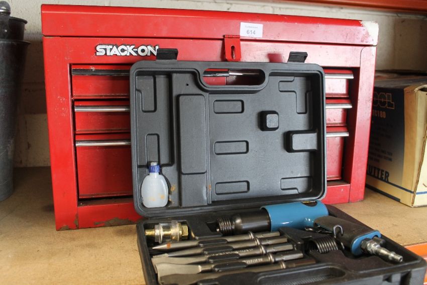 A RED FOUR DRAWER TOOL BOX AND AN AIR CHISEL