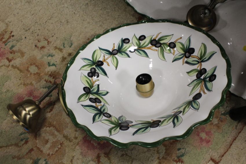 A SELECTION OF ASSORTED CERAMICS TO INCLUDE CONTINENTAL STYLE LAMPSHADES, TWIN HANDLED TRAY ETC