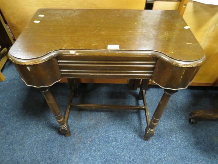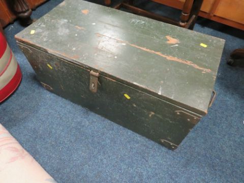 AN OAK SIDE TABLE, VINTAGE TOOL BOX AND A STOOL (3)