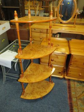 A HONEY PINE DRESSING TABLE, MIRROR, THREE STOOLS, A PAIR OF BEDSIDE CHESTS AND A WOT-NOT