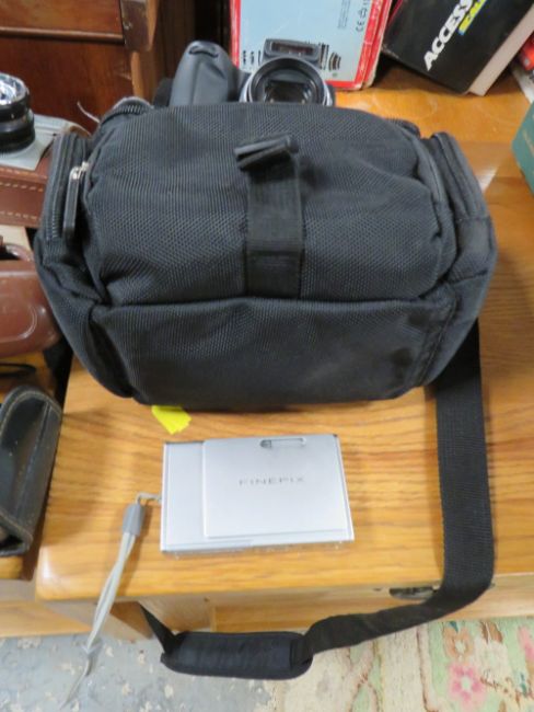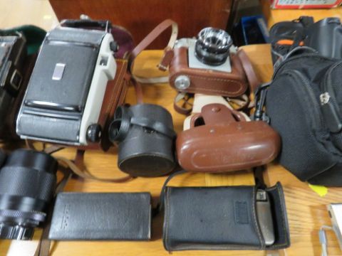 TRAY OF CAMERAS / LENSES AND PHOTOGRAPHY EQUIPMENT TO INCLUDE KODAK KODETTE 32 SHUTTER CAMERA, LEATHER CASED KODAK FOLDING BROWNIE SIX-20 CAMERA, HALINA ROLLS CAMERA, FUJI FINEPIX DIGITAL CAMERA, 2 OTHER CAMERAS, PALAR ZOOM LENS f=135mm,1:3.5 AND VIVITOR AUTOMATIC TELE CONVERT