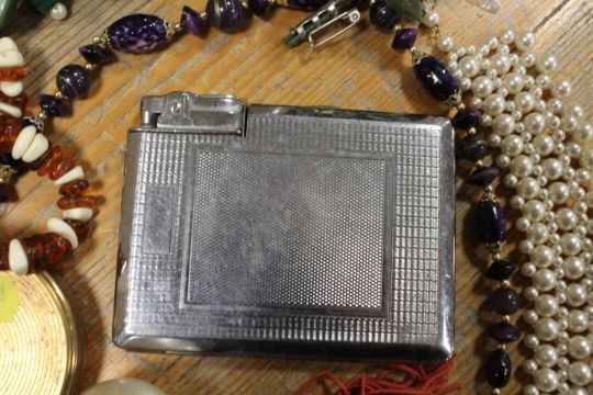 A TRAY OF ASSORTED COSTUME JEWELLERY, COMPACTS ETC TO INCLUDE AN ART DECO BEAD NECKLACE