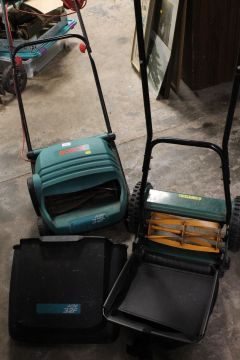 A BOSCH ELECTRIC LAWN MOWER AND A HAND PUSH LAWN MOWER