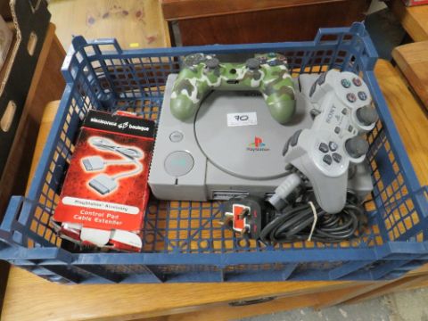 A TRAY CONTAINING PLAYSTATION 1 AND TWO HAND CONTROLLERS
