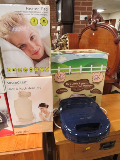 A SELECTION OF ELECTRICAL ITEMS TO INCLUDE BOXED COMBO GENIUS TRIO RACER F1 RACING WHEEL FPR PC, PS3 AND Wii GAMES, UNBOXED HINARI SANDWICH TOASTER, BOXED MONHOUSE ELECTRIC BLANKET, BOXED SILVERCREST FOOTWARMER, BOXED SILVERCREST BACK & NECK HEAT PAD AND BOXED THIS LITTLE PIGGY FOOT MASSAGER