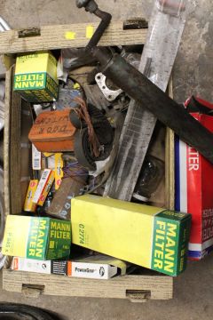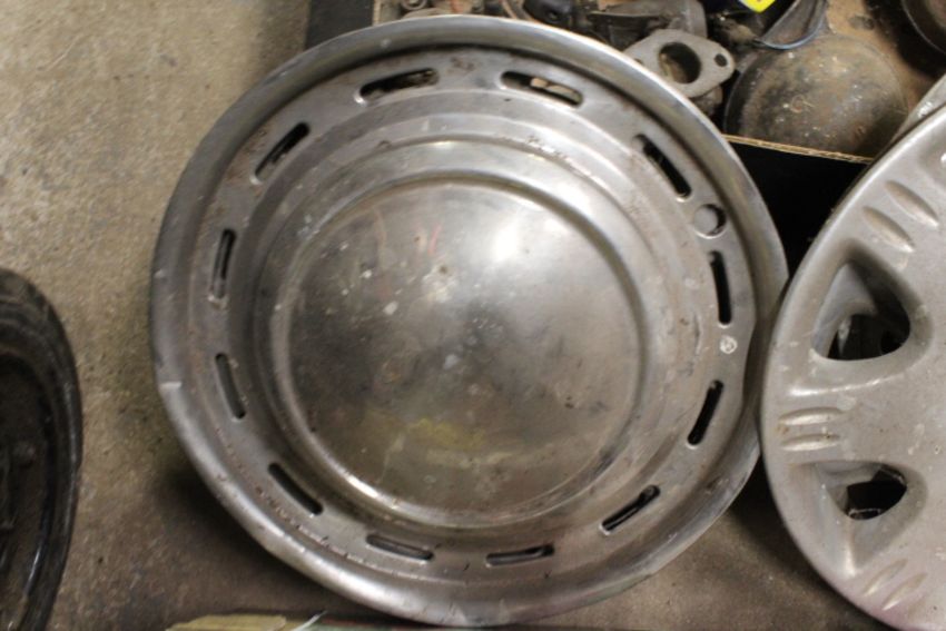 TWO BOXES OF VINTAGE CAR SPARES TO INCLUDE A JOCKEY WHEEL AND CHROME WHEEL DISCS