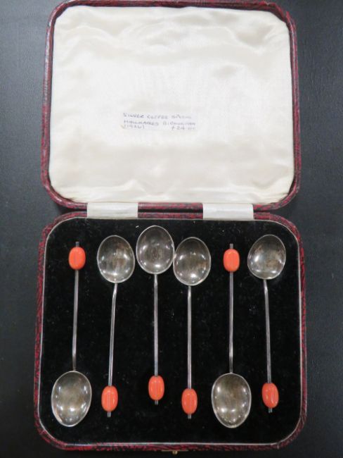 A CASED SET OF HALLMARKED SILVER COFFEE BEAN SPOONS WITH PINK FINIALS