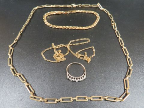AN ASSORTMENT OF YELLOW METAL COSTUME JEWELLERY ETC TO INCLUDE A SILVER RING