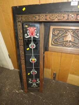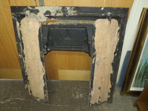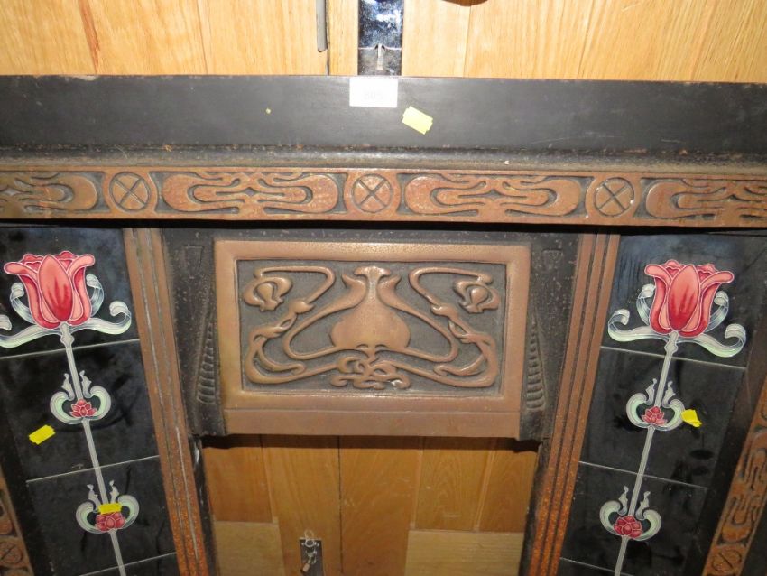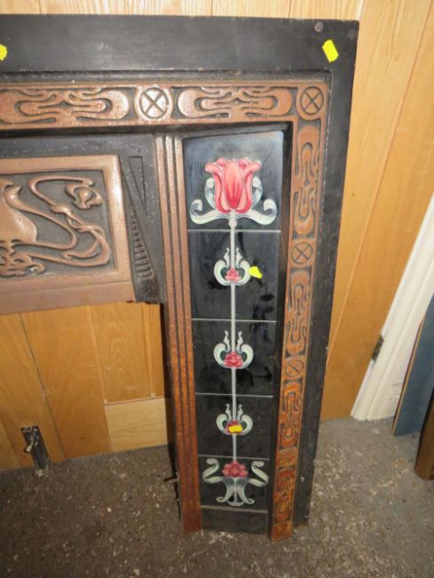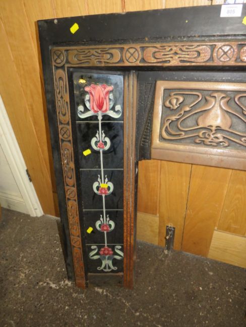 A CAST IRON FIRE SURROUND WITH TUBELINED TILES