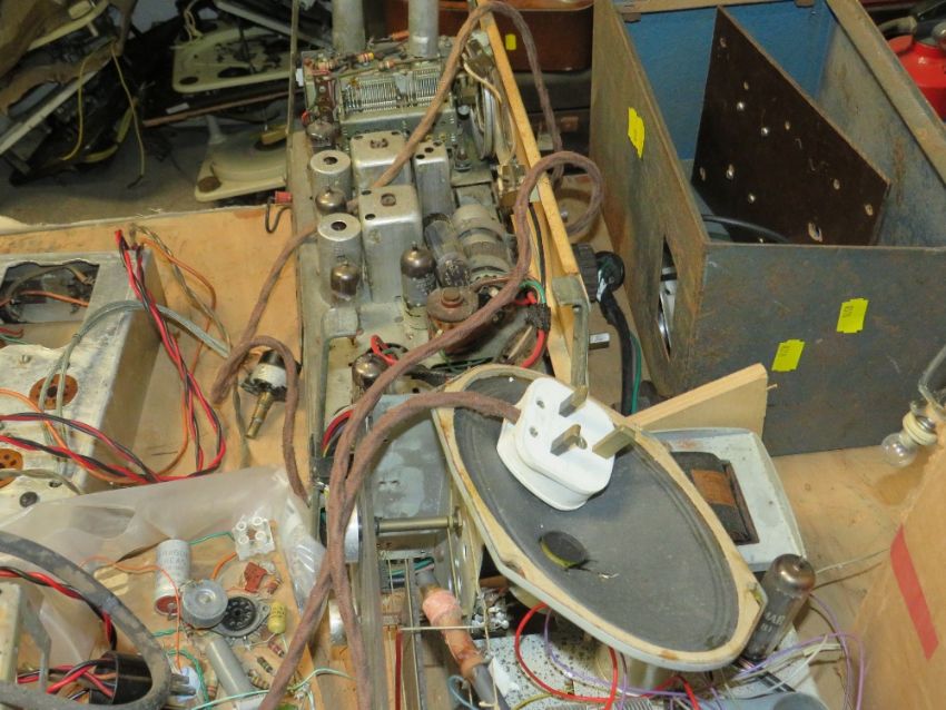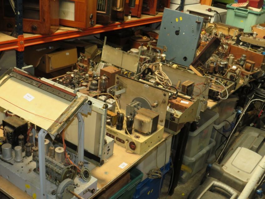 TWO TABLE TOPS CONTAINING A HUGE SELECTION OF VARIOUS DISMANTLED VALVE RADIO CHASSIS AND OTHER AUDIO COMPONENTS