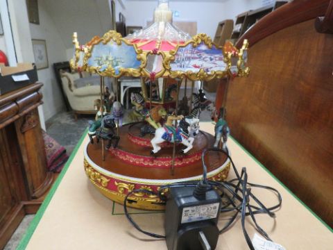 A MR CHRISTMAS TRIPLE DECKER TWELVE HORSE MUSICAL CAROUSEL, Dia. 25 cm, COMPLETE WITH LEAD, IN WORKING ORDER WHEN CONSIGNED