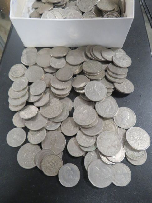 A BOX OF OLD SHILLING AND FLORIN COINS