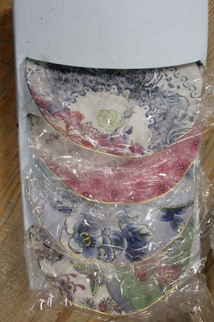 A BOXED SET OF WEDGWOOD BUTTERFLY BLOOM TEA PLATES TOGETHER WITH THREE CUT GLASS DECANTERS