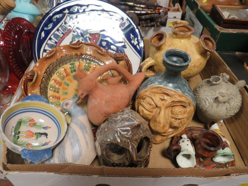 TWO TRAYS OF ASSORTED CERAMICS ETC TO INCLUDE A CAST FIGURE OF A TRUMPETER A/F CLAY POTS ETC