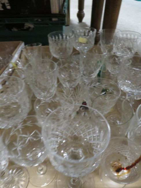 TWO TRAYS OF GLASSWARE TO INCLUDE DRINKING GLASSES , CANDLESTICKS ETC