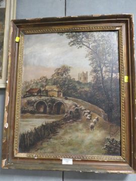 AN OIL ON CANVAS DEPICTING SHEEP CROSSING A BRIDGE SIGNED LOWER RIGHT