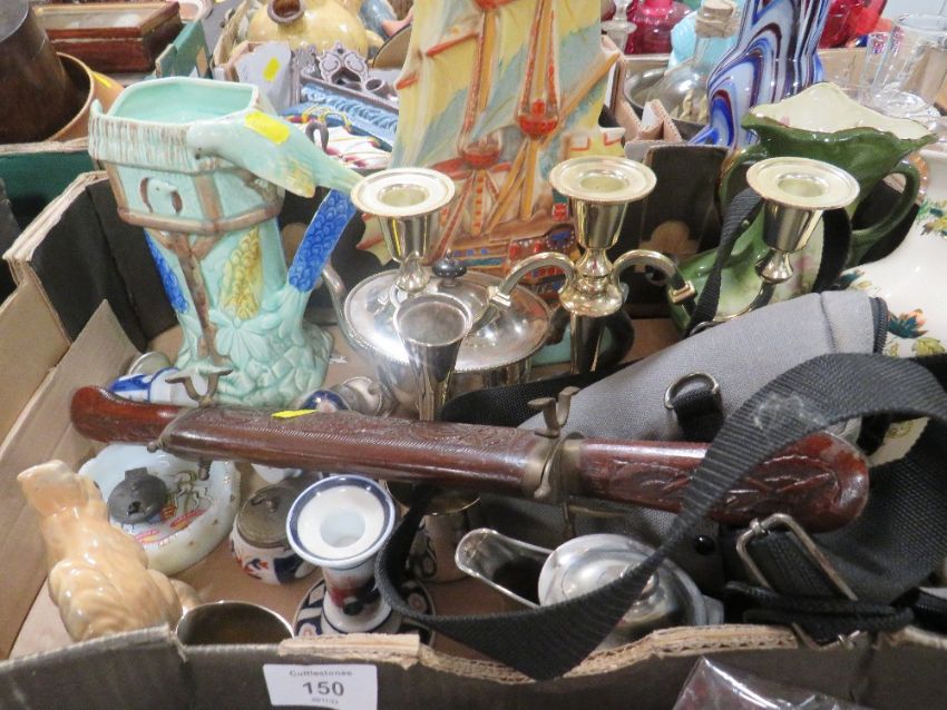A TRAY OF CERAMICS METAL WARE ETC TO INCLUDE A WADE HEATH BIRD JUG A/F, MASONS CHARTREUSE VASES ETC