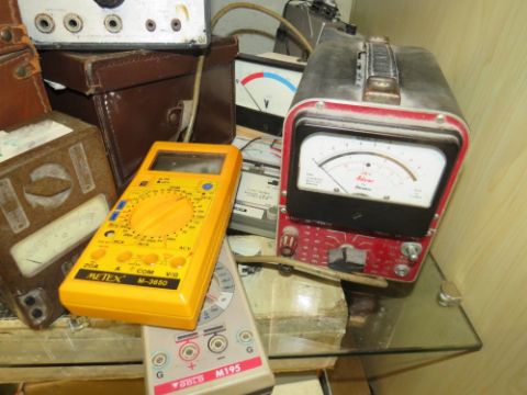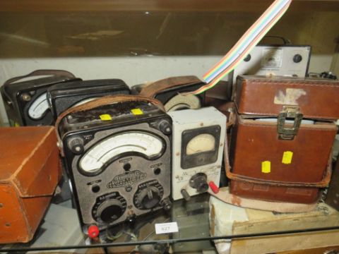 A SHELF CONTAINING VARIOUS AVO METERS AND OTHER ELECTRCIAL TESTERS