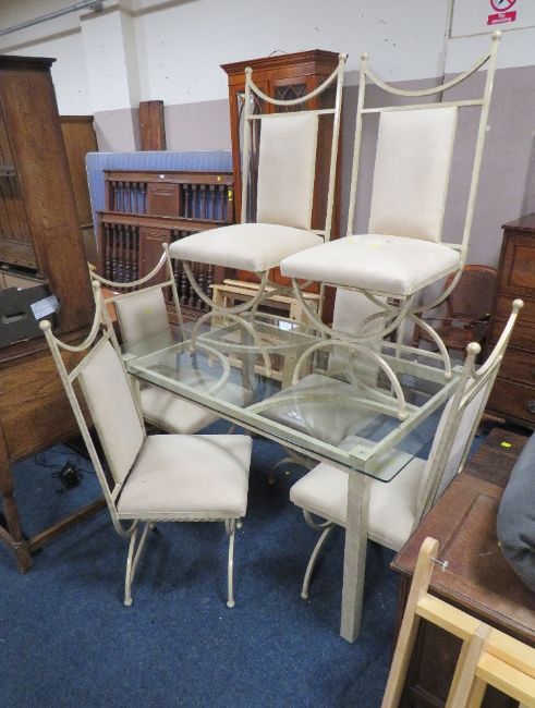 A MODERN GLASS AND METAL DINING TABLE AND SIX CHAIRS