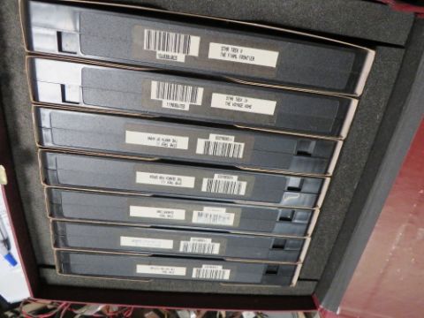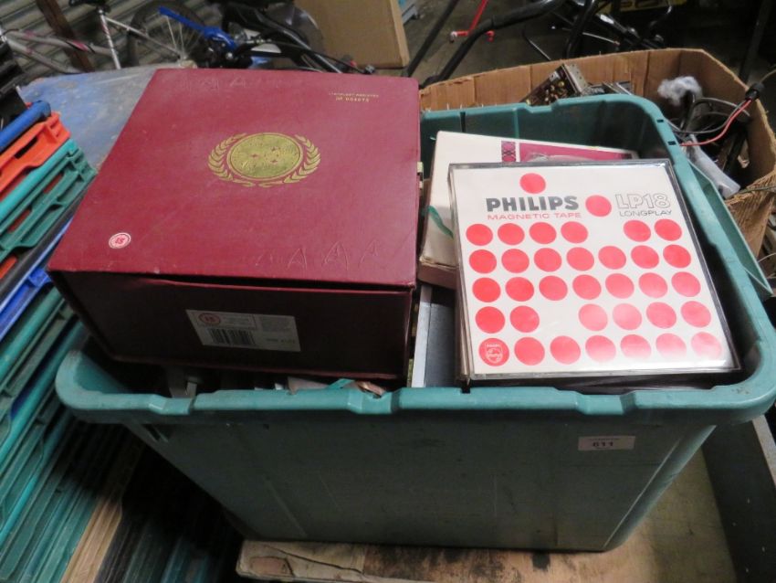 A BOX CONTAINING VARIOUS MAGNETIC TAPE REELS AND A VHS STAR TREK BOX SET