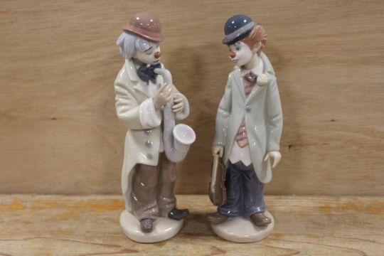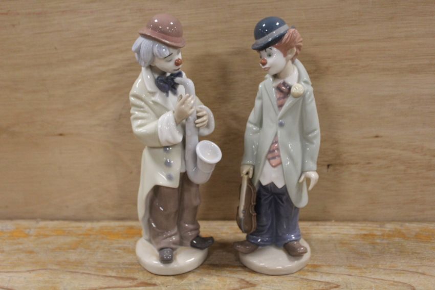 A LLADRO FIGURE OF A CLOWN PLAYING THE SAXOPHONE TOGETHER WITH A CLOWN WITH VIOLIN - A/F