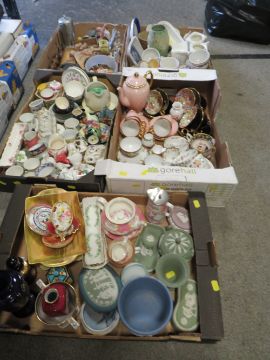 FIVE TRAYS OF ASSORTED CERAMICS AND COLLECTABLES TO INCLUDE WEDGWOOD JASPER WARE AND OLD TUPTON WARE