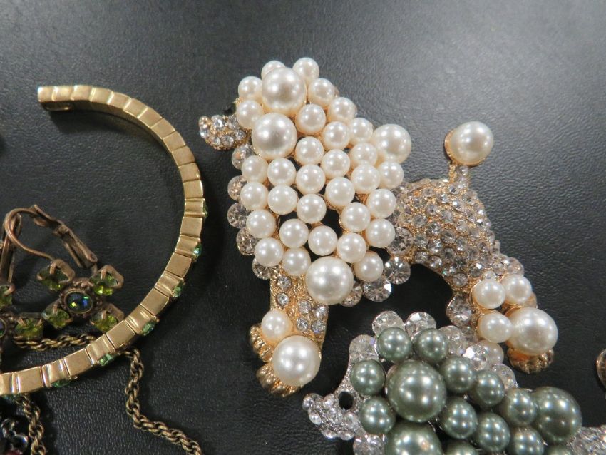 A COLLECTION OF DESIGNER COSTUME JEWELLERY TO INCLUDE A BUTLER AND WILSON CHRISTMAS NECKLACE, KIRKS FOLLY EARRINGS, SWEET ROMANCE NECKLACE AND TWO POODLE BROOCHES POSSIBLY KENNETH JAY LANE (6)
