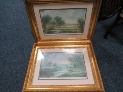 A VINTAGE OAK FRAMED PRINT, HUNTING PRINT AND A PAIR OF LANDSCAPE PRINTS (4)