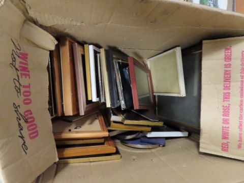 A BOX OF ASSORTED SMALL PICTURES, PRINTS AND FRAMES