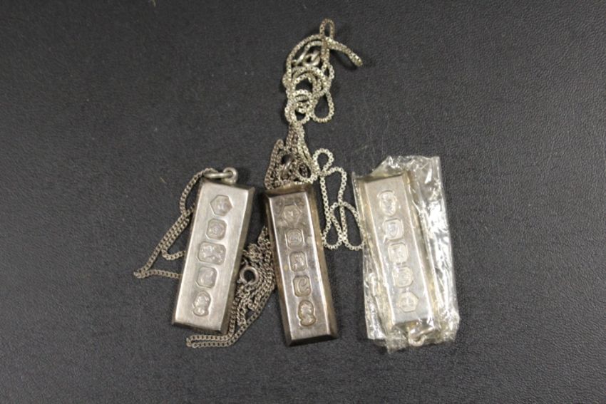 THREE HALLMARKED SILVER INGOT STYLE NECKLACES