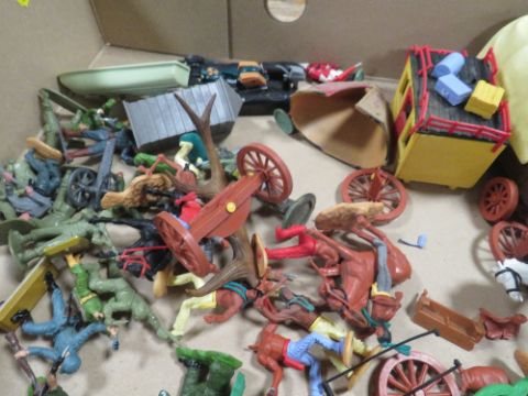 A LARGE SELECTION OF VINTAGE TIMPO WILD WEST FIGURES, INDIANS, CARRIAGES`, AIRFIX FIGURES ETC