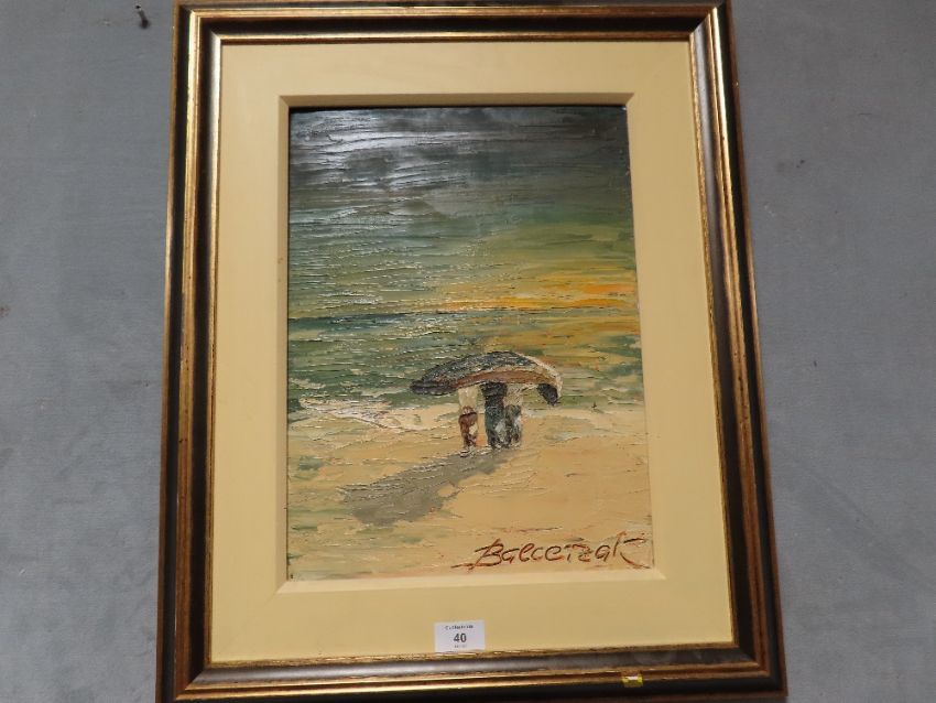 A FRAMED OIL ON BOARD OF A FISHERMAN CARRYING A BOAT SIGNED LOWER RIGHT DETAILS VERSO- ON PICTURE WALL