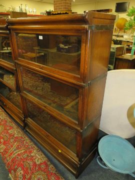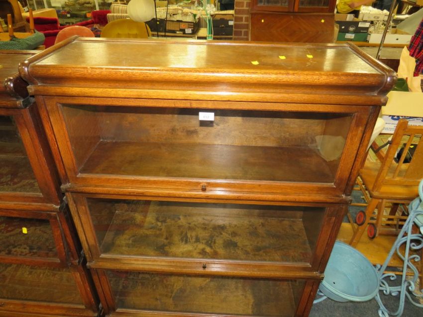 A VINTAGE OAK THREE STAGE GLOBE WERNICKE STYLE BOOKCASE - H 130 cm, W 87 cm