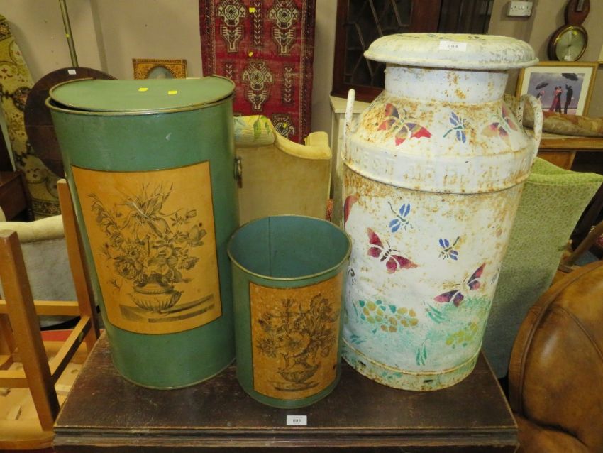 A VINTAGE PAINTED MILK CHURN PLUS TWO METAL BINS