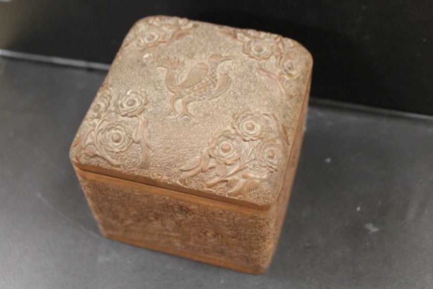 A VINTAGE CARVED WOODEN CIGAR TYPE BOX WITH INSCRIPTION "2nd LT B GUINESS FOR 20th FIELD BAKERY JUNE 1941"