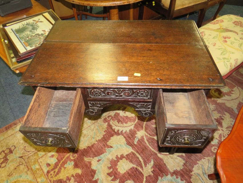AN ANTIQUE CARVED OAK LOWBOY WITH THREE FRIEZE DRAWERS - W 77 cm