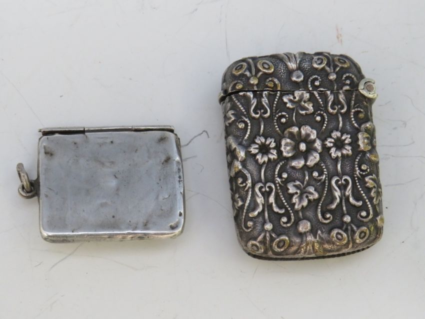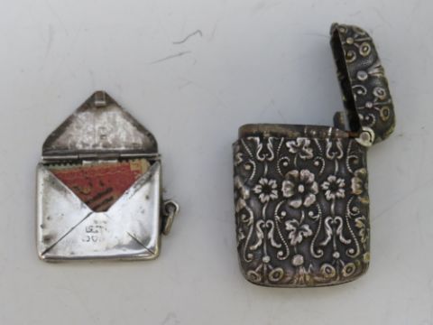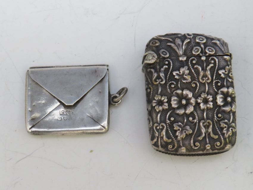 A VINTAGE ORNATE WHITE METAL VESTA CASE, together with a hallmarked silver envelope stamp case, 2 x 23.5 cm (2)