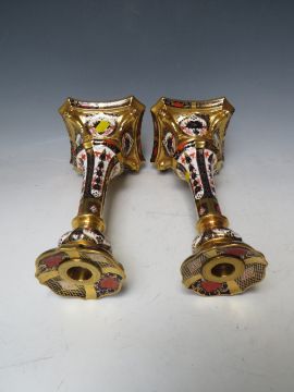 A PAIR OF ROYAL CROWN DERBY OLD IMARI PATTERN CANDLESTICKS - ONE CANDLESTICK A/F, pattern no. 1128, H 28 cm