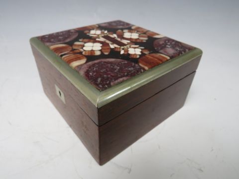A VINTAGE PIETRA DURA AND ROSEWOOD BOX, H 6 cm, W 11 cm, D 10 cm