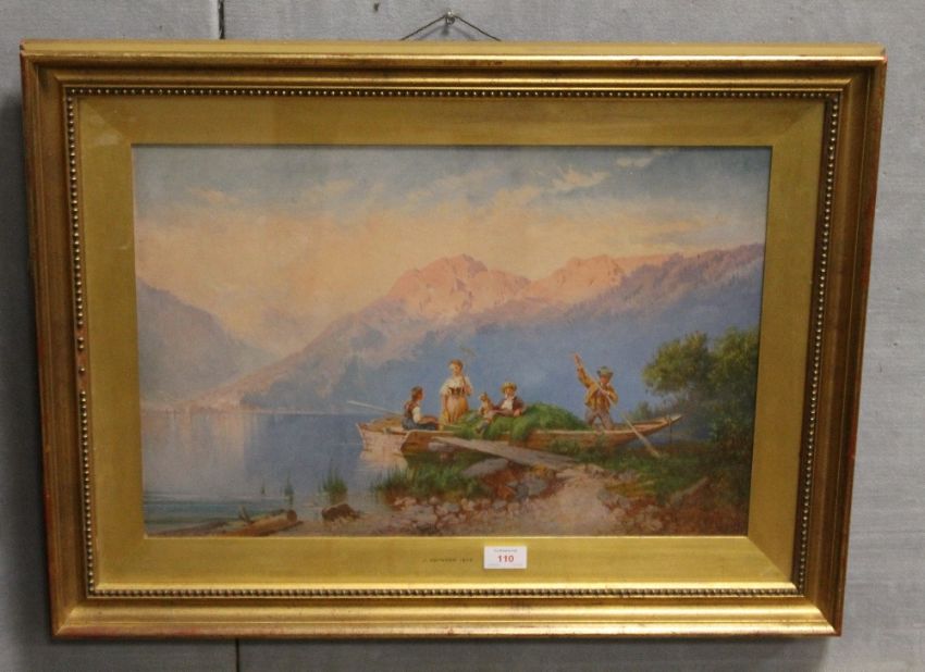 J. JOHNSON (XIX). A lakeland scene at Llyn Ogwen with figures, dog and boat, see inscription verso, unsigned, oil on board, framed and glazed, 35 x 54 cm