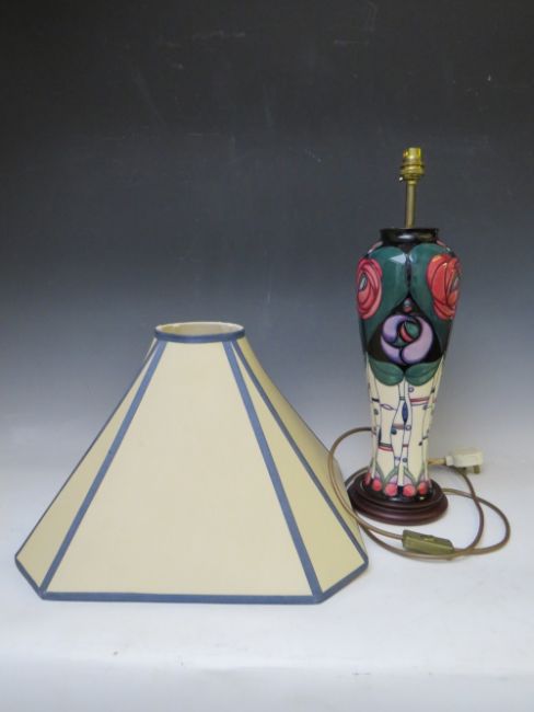 A TALL MODERN MOORCROFT POTTERY "TRIBUTE TO CHARLES RENNIE MACKINTOSH" PATTERN TABLE LAMP AND SHADE, designed by Rachael Bishop, of slender form, on a turned wooden base, H 49 cm (top of bulb fitting, not including shade)