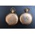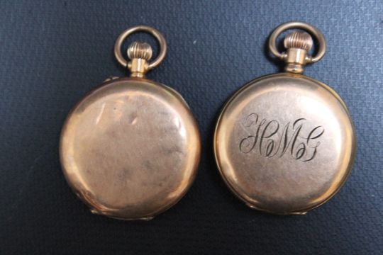 A 14K CASED SMALL HALF HUNTER FOB WATCH, together with a gold plated Waltham example, Dia 3.25 cm (2)