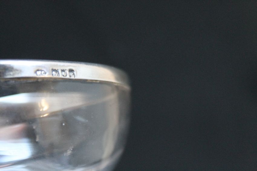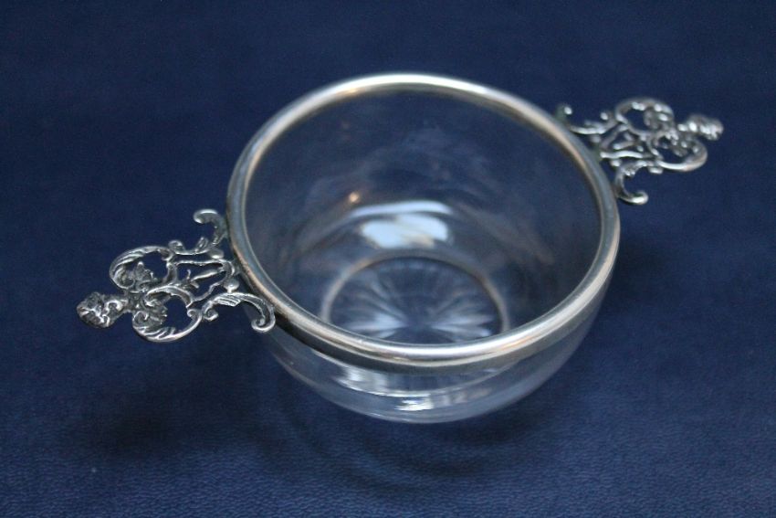 A HALLMARKED SILVER AND GLASS QUAICH BY WILLIAM COMYNS - LONDON 1902, with typical Comyns style pierced handles, W 12.5 cm